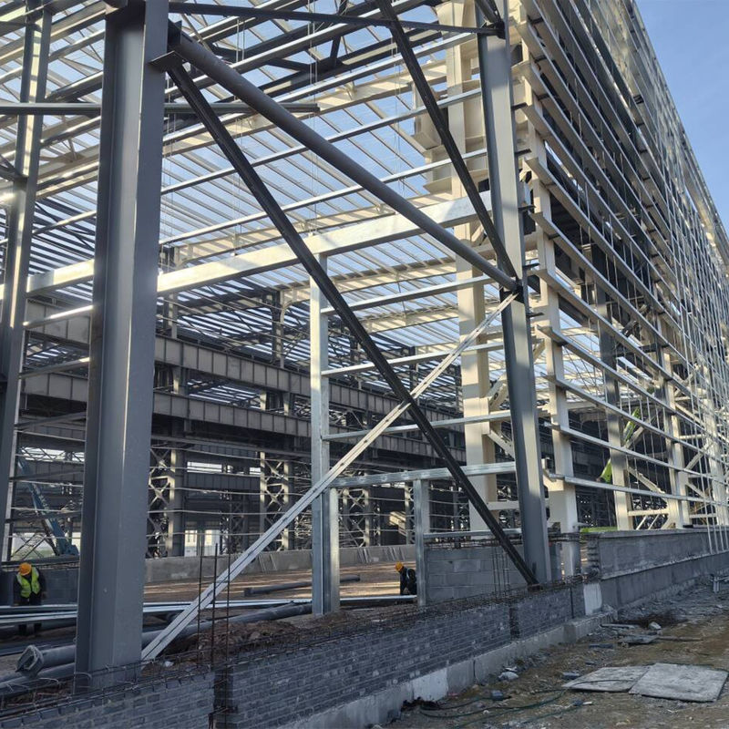 Sistema de suporte: Inclui suportes entre colunas (para resistir a forças horizontais longitudinais) e suportes de telhado (para garantir a estabilidade fora do plano), e usa principalmente perfis de aço angular, aço redondo ou aço em forma de H.